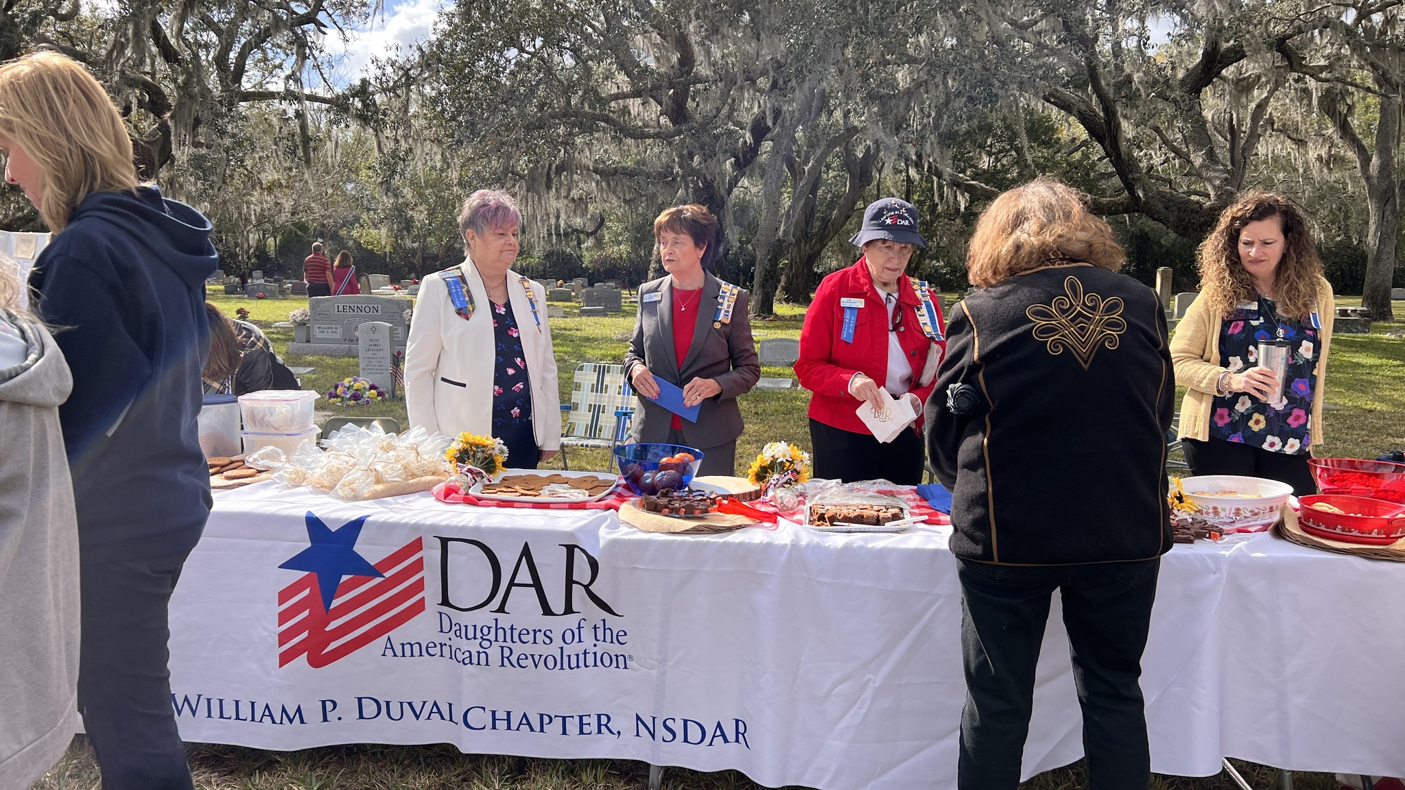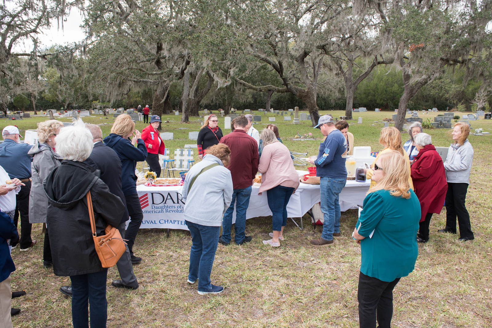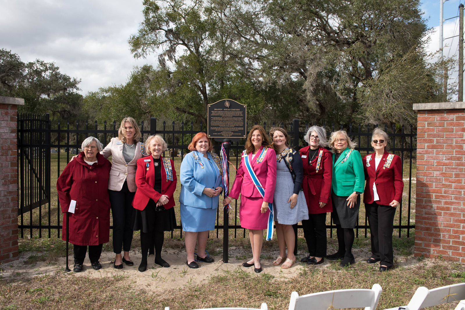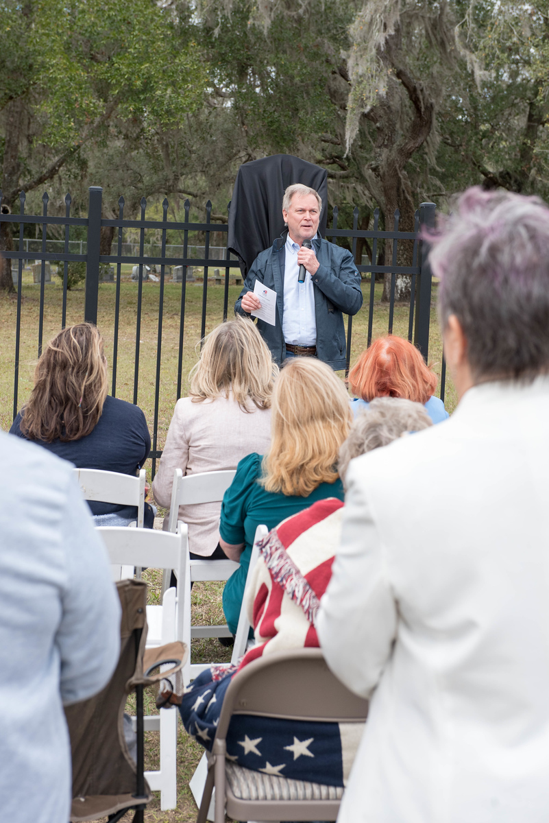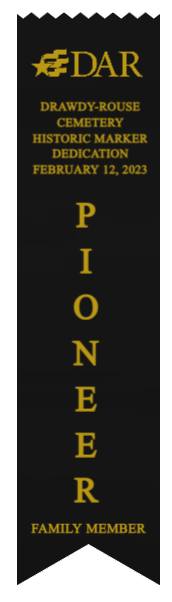 On February 12, 2023, the William P. Duval Chapter, Daughters of the American Revolution of Winter Park, dedicated a DAR historic plaque at the Drawdy-Rouse Family Cemetery. Over 75 people were in attendance. Chuck Drake, President of the Drawdy-Rouse Cemetery board, spoke. Denise Aldridge spoke on behalf of the descendants of the Rouse family, and Emmett Browning spoke on behalf of the Drawdy descendants. Leslie Beltz, Regent of the DAR Chapter, spoke, as did Elaine Powell, then Vice Regent and Secretary of the Drawdy-Rouse Cemetery Board of Directors. Honorary Regent Ann Maner was most instrumental in getting the approvals for the plaque and obtained the permission from the NSDAR. She also did all the research required to get approval for the plaque and helped to raise the funds to purchase the plaque. Each fact stated on the plaque had to be verified with documents to obtain permission from the NSDAR Historian General. Refreshments that were historically accurate to the time of the founding of the cemetery in the mid-1800s were prepared and served by members of the William P. Duval Chapter.