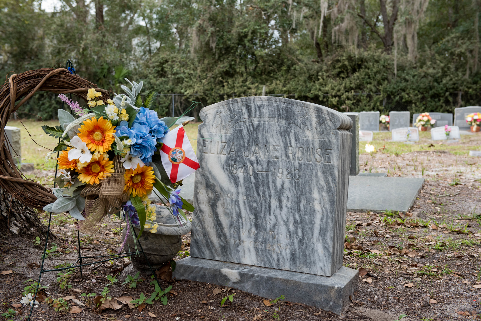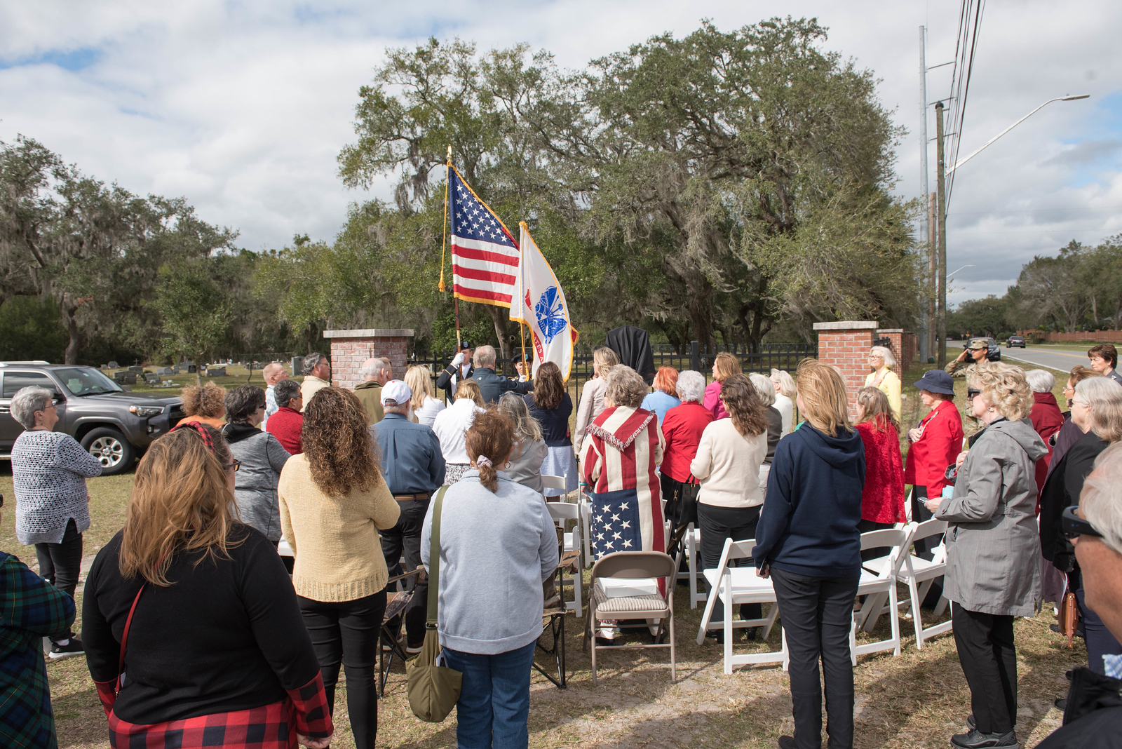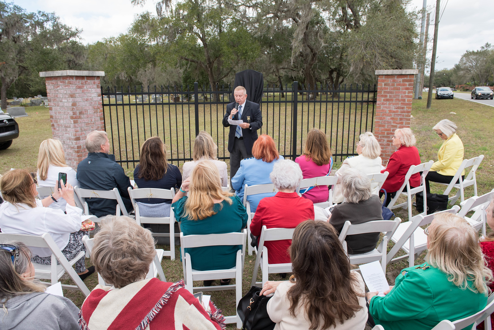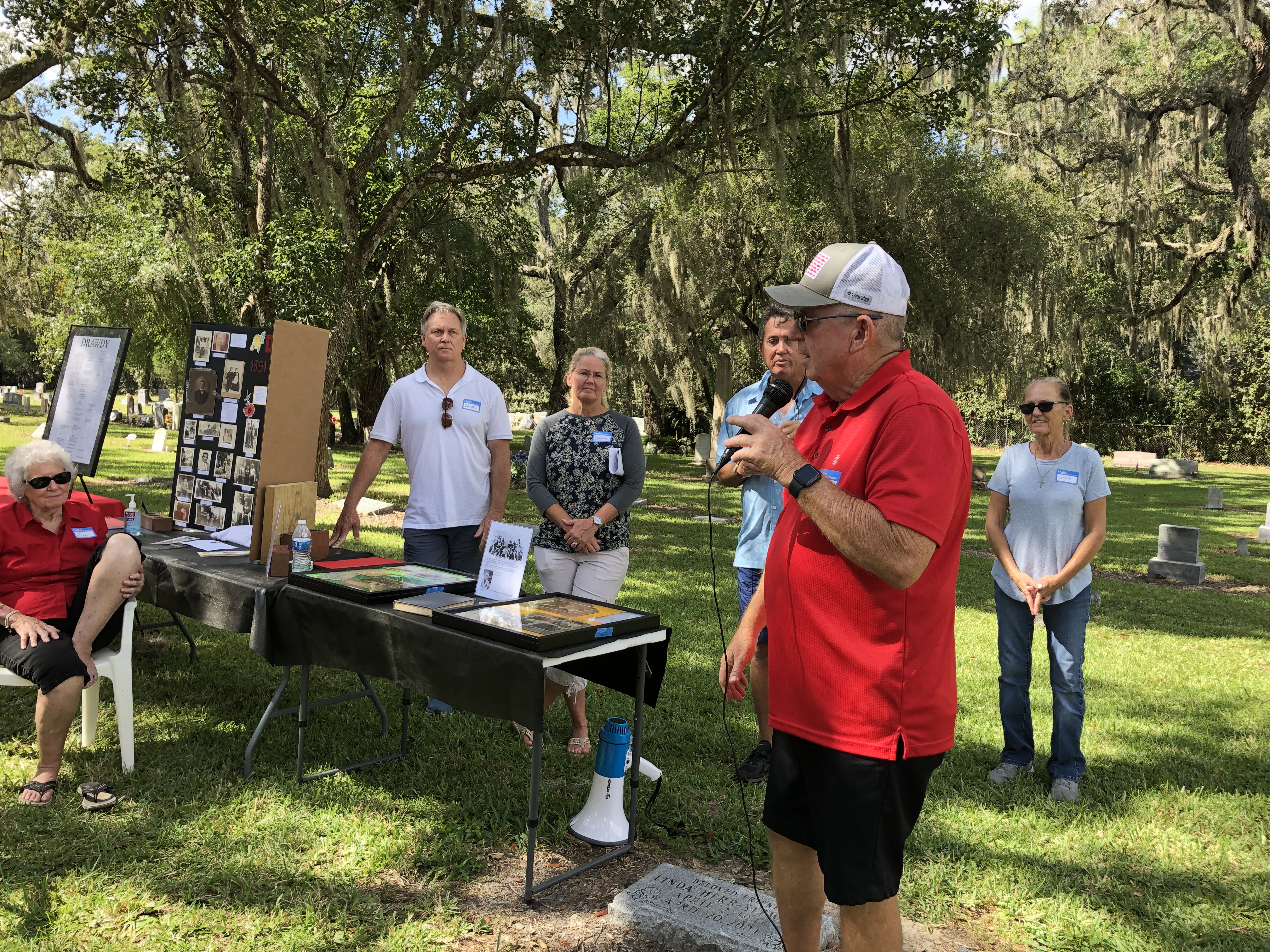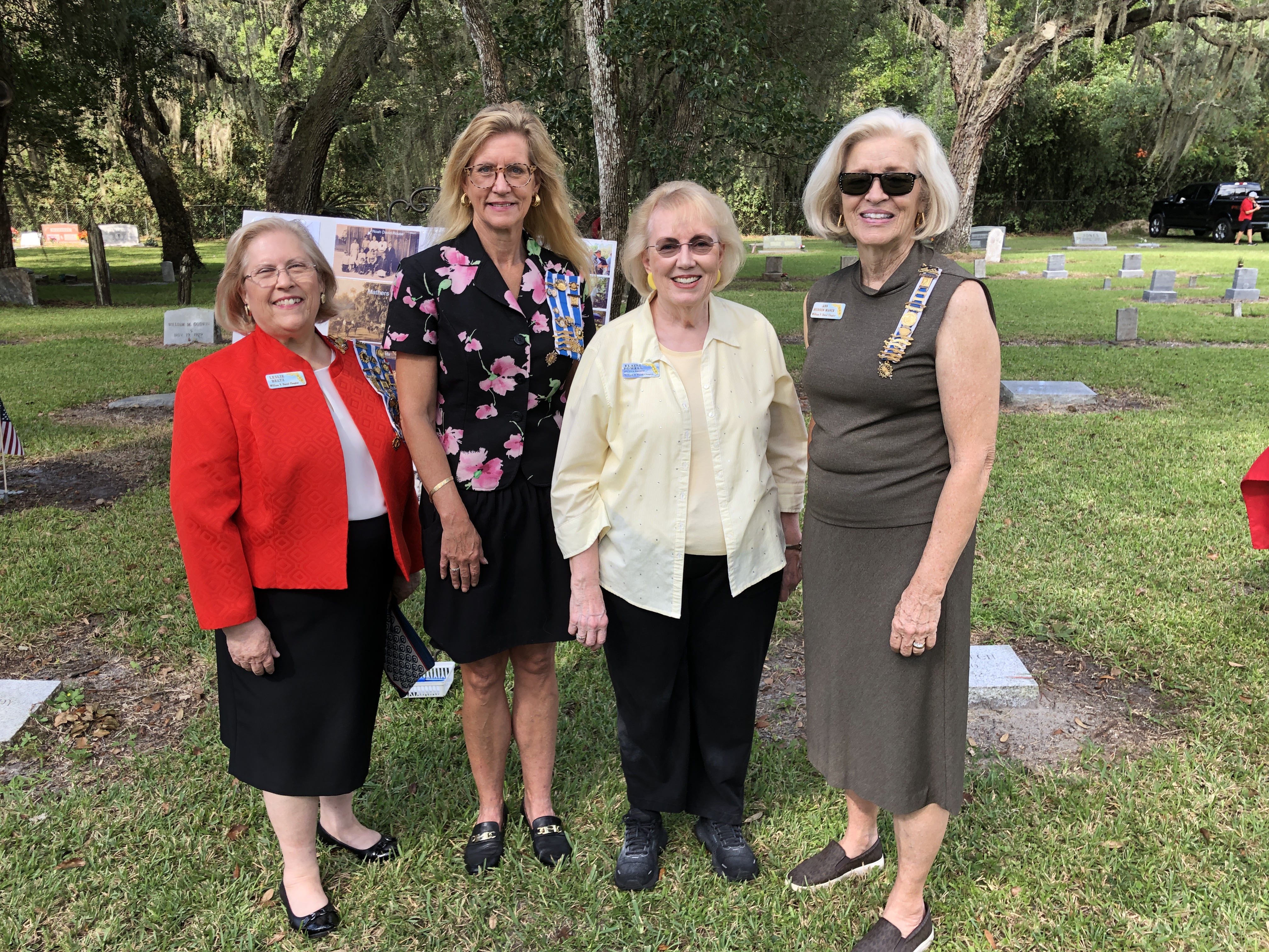 On February 12, 2023, the William P. Duval Chapter, Daughters of the American Revolution of Winter Park, dedicated a DAR historic plaque at the Drawdy-Rouse Family Cemetery. Over 75 people were in attendance. Chuck Drake, President of the Drawdy-Rouse Cemetery board, spoke. Denise Aldridge spoke on behalf of the descendants of the Rouse family, and Emmett Browning spoke on behalf of the Drawdy descendants. Leslie Beltz, Regent of the DAR Chapter, spoke, as did Elaine Powell, then Vice Regent and Secretary of the Drawdy-Rouse Cemetery Board of Directors. Honorary Regent Ann Maner was most instrumental in getting the approvals for the plaque and obtained the permission from the NSDAR. She also did all the research required to get approval for the plaque and helped to raise the funds to purchase the plaque. Each fact stated on the plaque had to be verified with documents to obtain permission from the NSDAR Historian General. Refreshments that were historically accurate to the time of the founding of the cemetery in the mid-1800s were prepared and served by members of the William P. Duval Chapter.