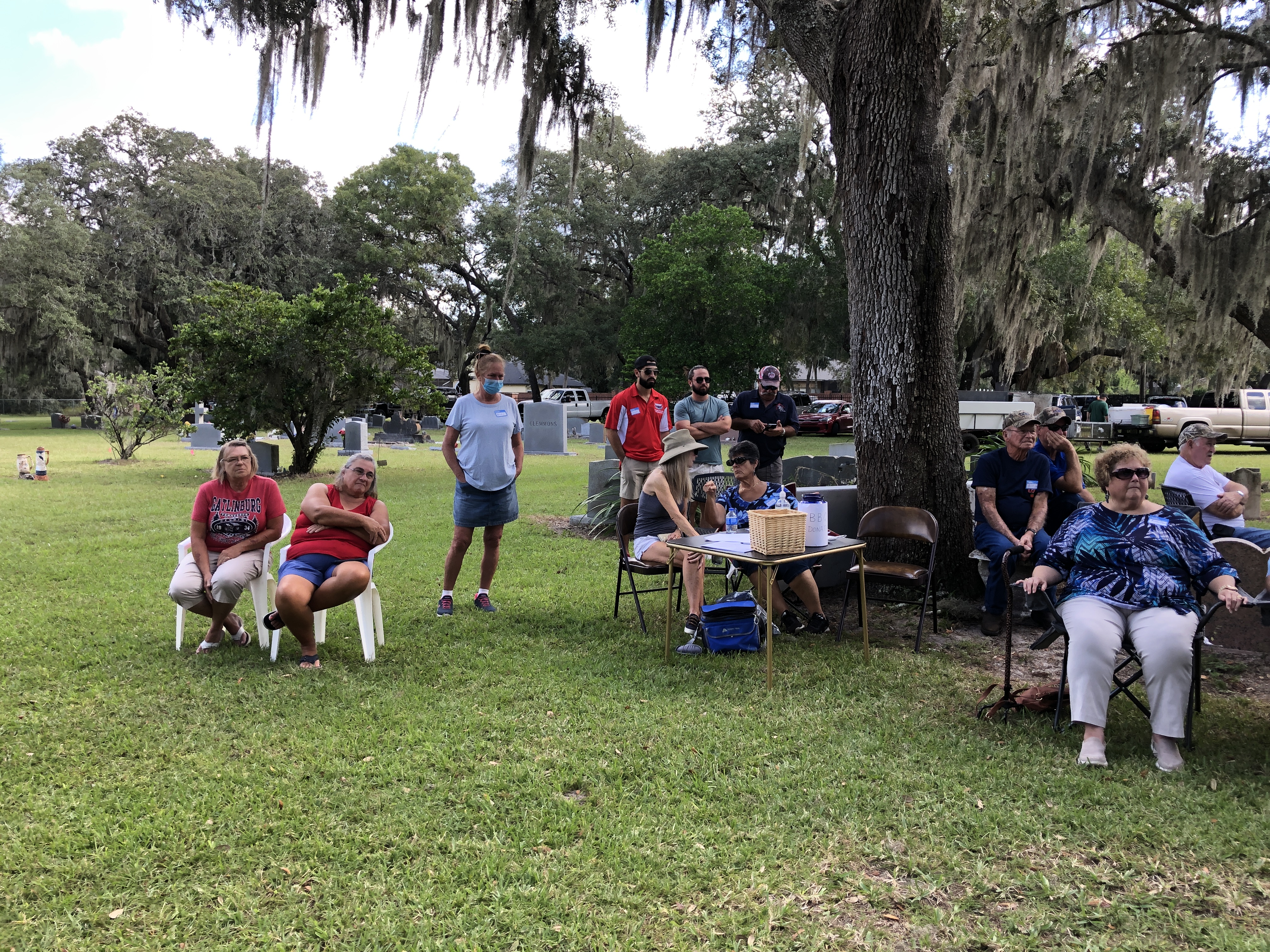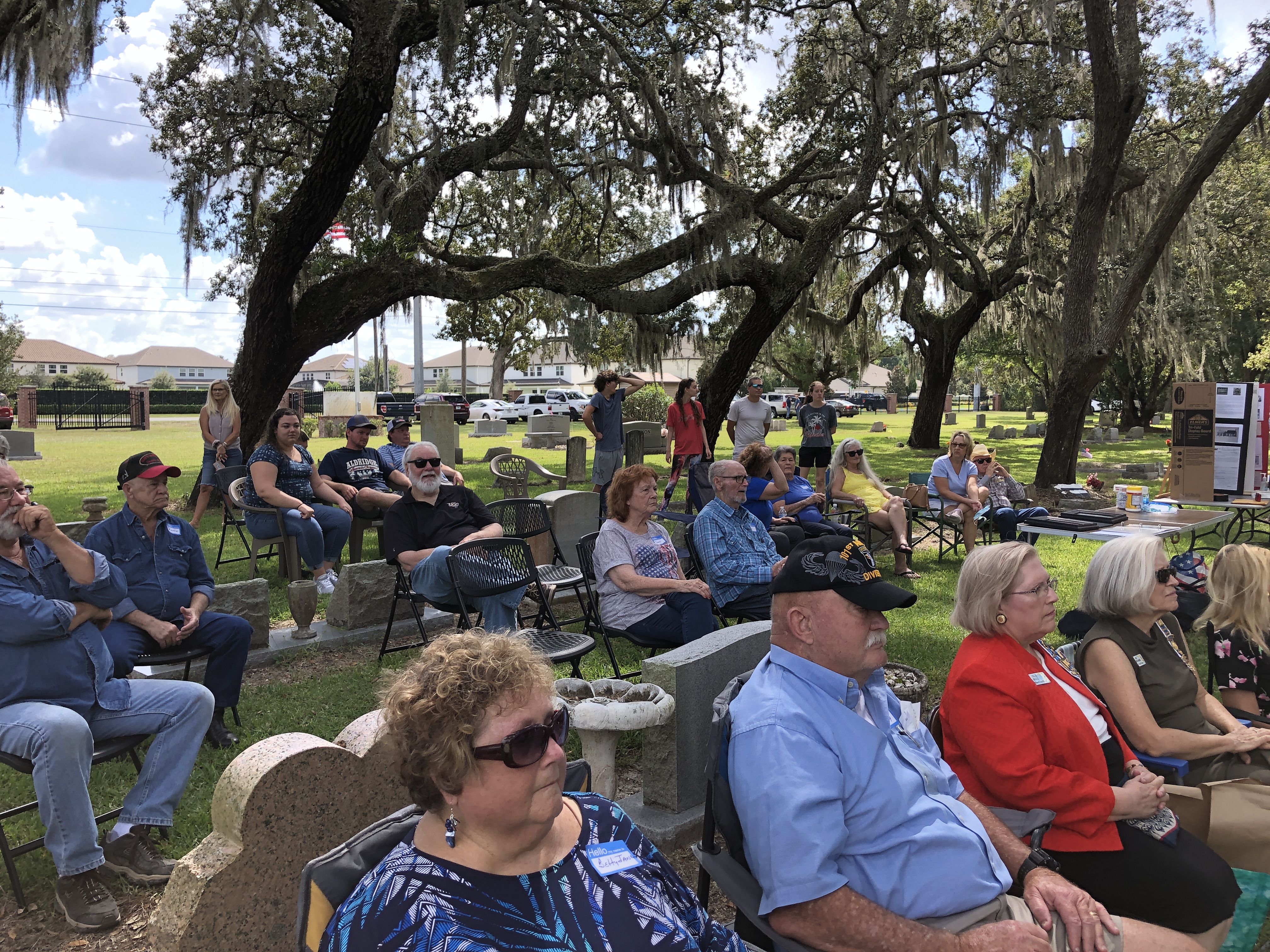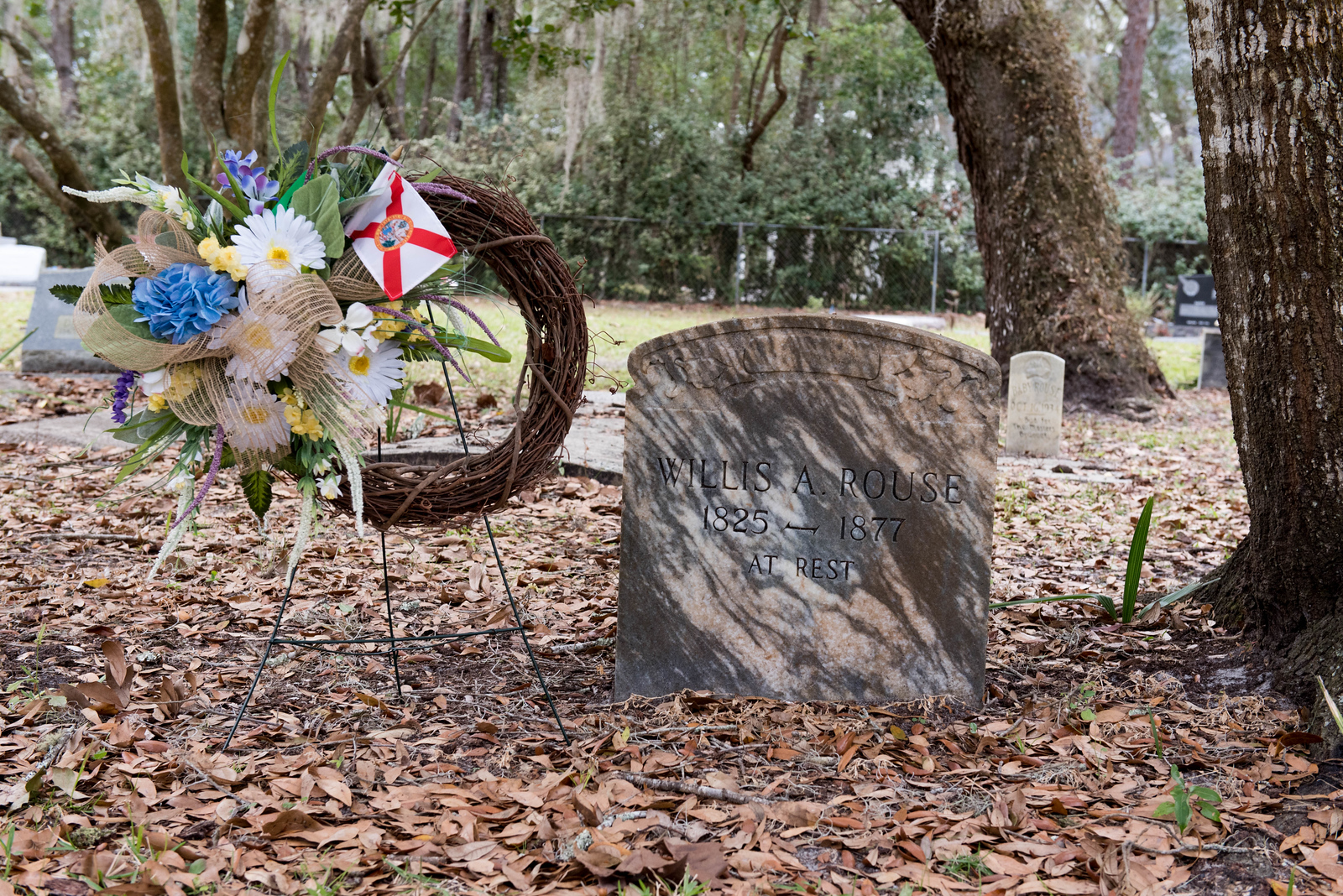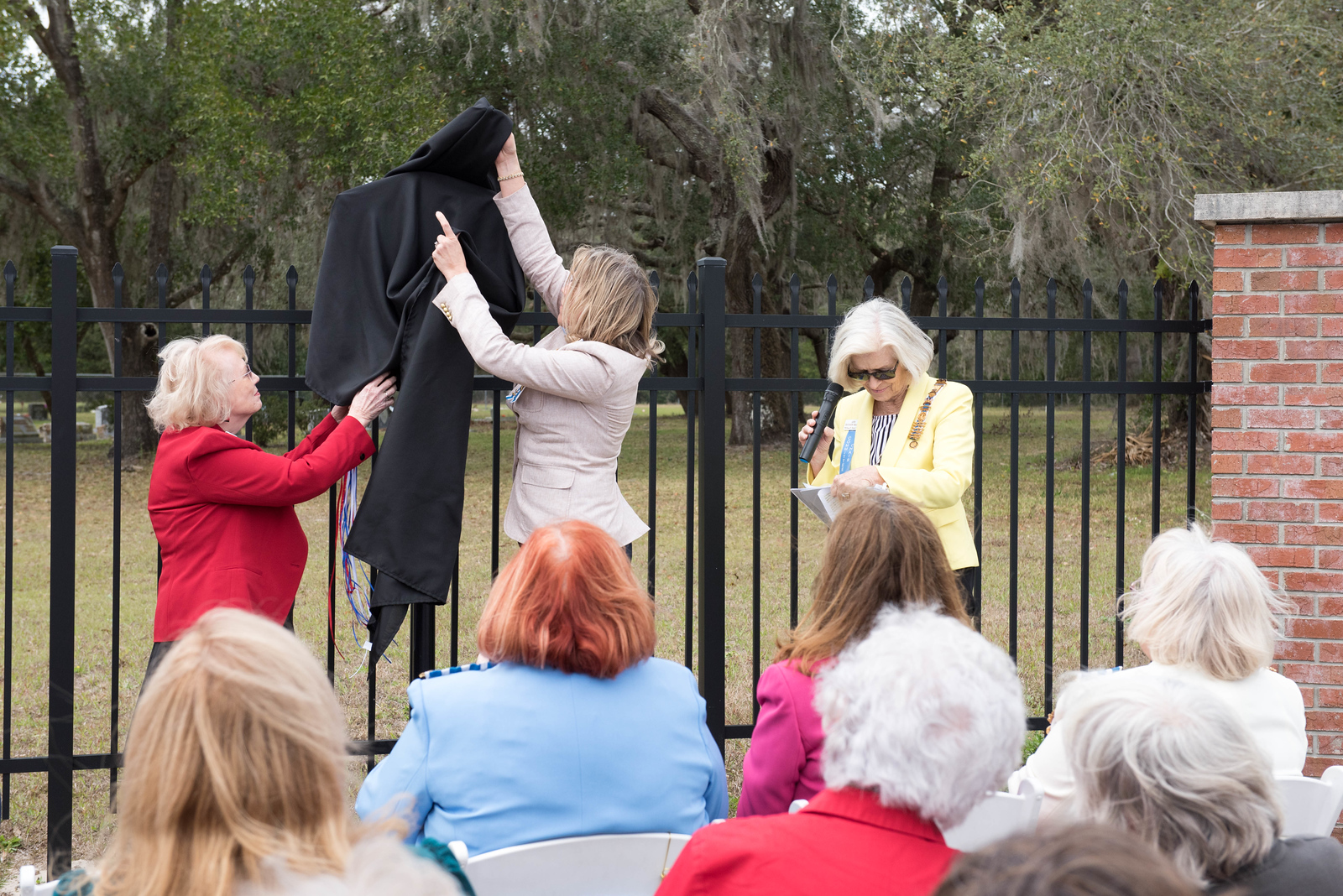 On February 12, 2023, the William P. Duval Chapter, Daughters of the American Revolution of Winter Park, dedicated a DAR historic plaque at the Drawdy-Rouse Family Cemetery. Over 75 people were in attendance. Chuck Drake, President of the Drawdy-Rouse Cemetery board, spoke. Denise Aldridge spoke on behalf of the descendants of the Rouse family, and Emmett Browning spoke on behalf of the Drawdy descendants. Leslie Beltz, Regent of the DAR Chapter, spoke, as did Elaine Powell, then Vice Regent and Secretary of the Drawdy-Rouse Cemetery Board of Directors. Honorary Regent Ann Maner was most instrumental in getting the approvals for the plaque and obtained the permission from the NSDAR. She also did all the research required to get approval for the plaque and helped to raise the funds to purchase the plaque. Each fact stated on the plaque had to be verified with documents to obtain permission from the NSDAR Historian General. Refreshments that were historically accurate to the time of the founding of the cemetery in the mid-1800s were prepared and served by members of the William P. Duval Chapter.